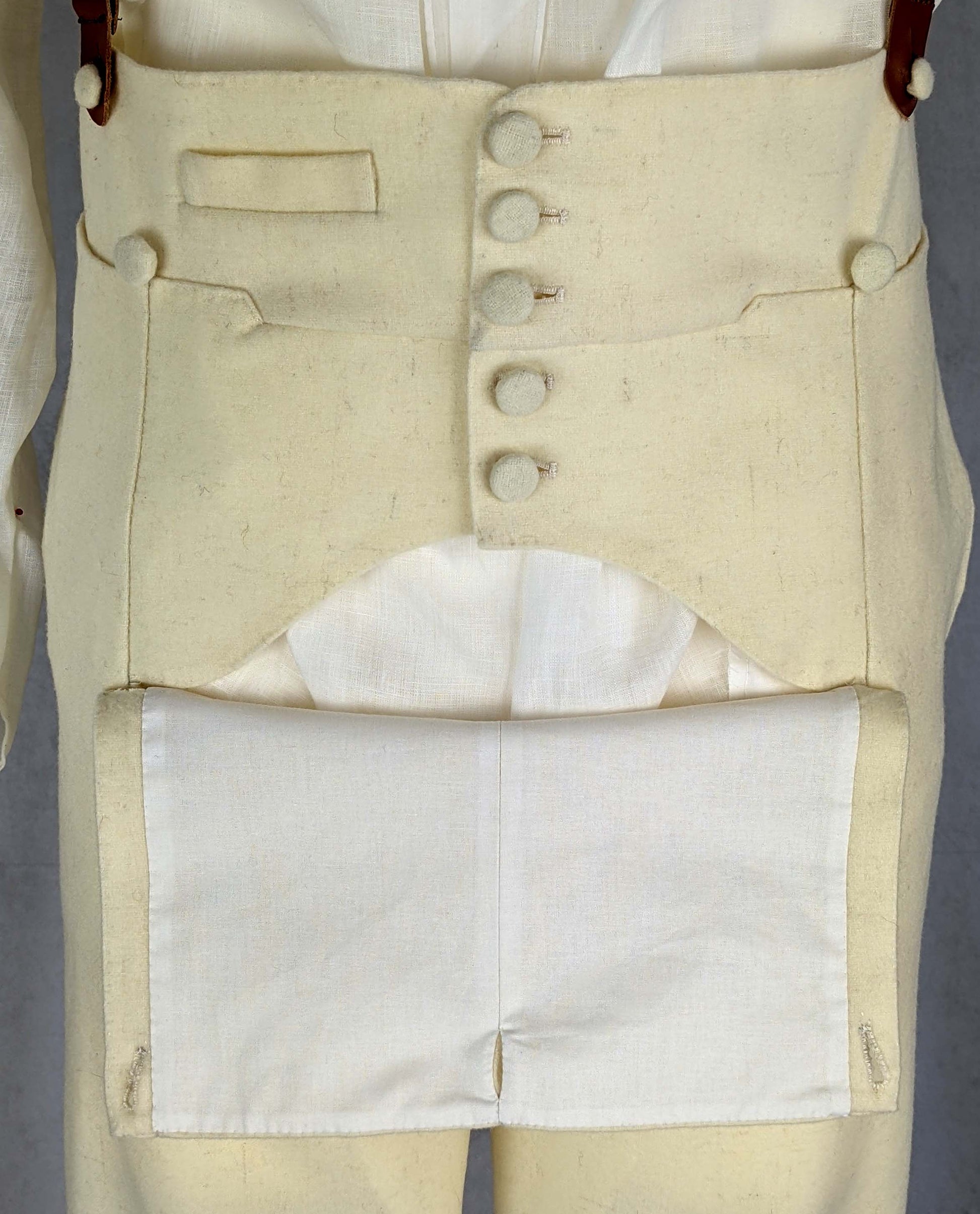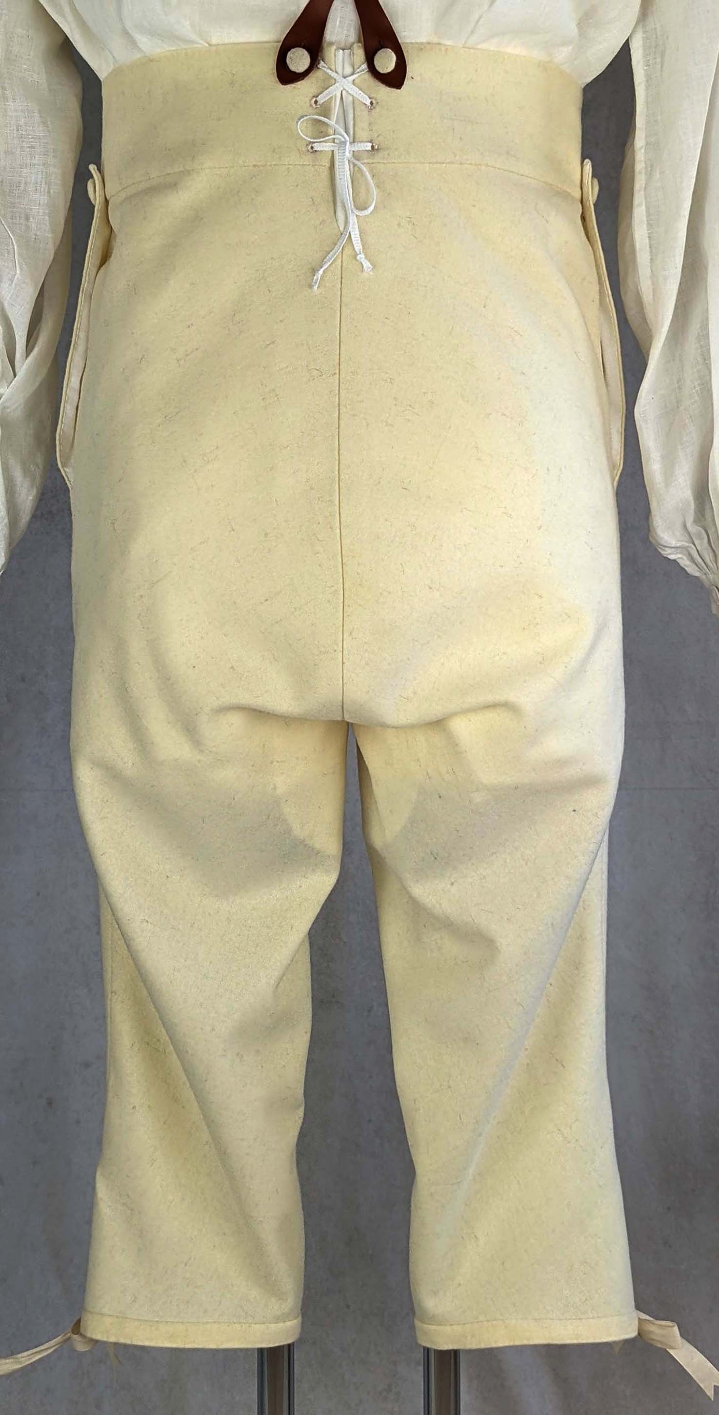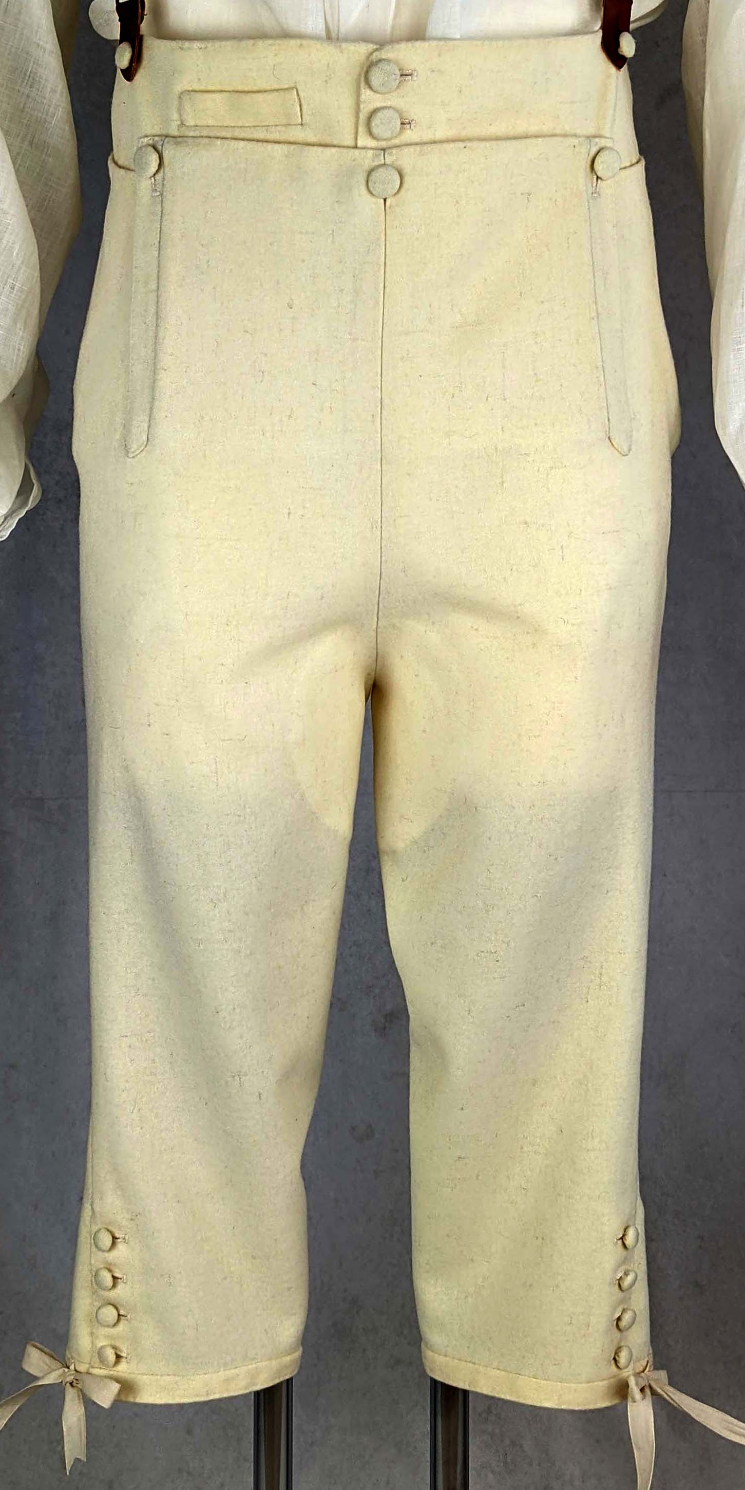 This sewing pattern shows breeches of the late 18th and early 19th century with a fall front, side pockets, and a coin pocket at the waistband (welt pocket). The breeches are buttoned at the knee, the narrow knee band is closed with ribbons. They have a wide waistband, buttoned in the front underneath the fall, the width of the waistband can be regulated with a cotton tape at the back. Compared to modern trousers, the breeches have a wide back and diverging legs to get the width needed while sitting on horseback. They are cut with one seam only along the outside leg, optionally the second leg seam can be added easily.
