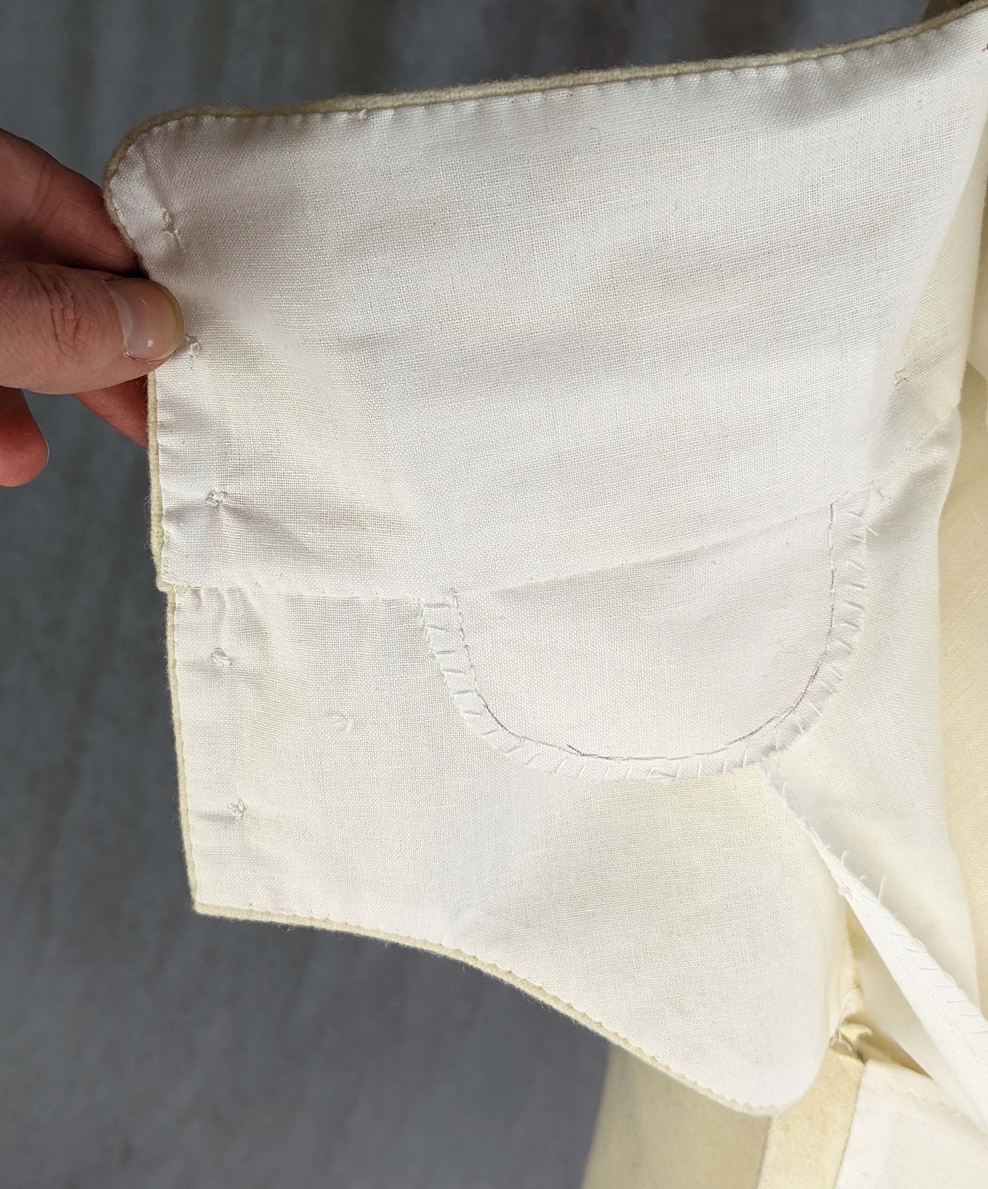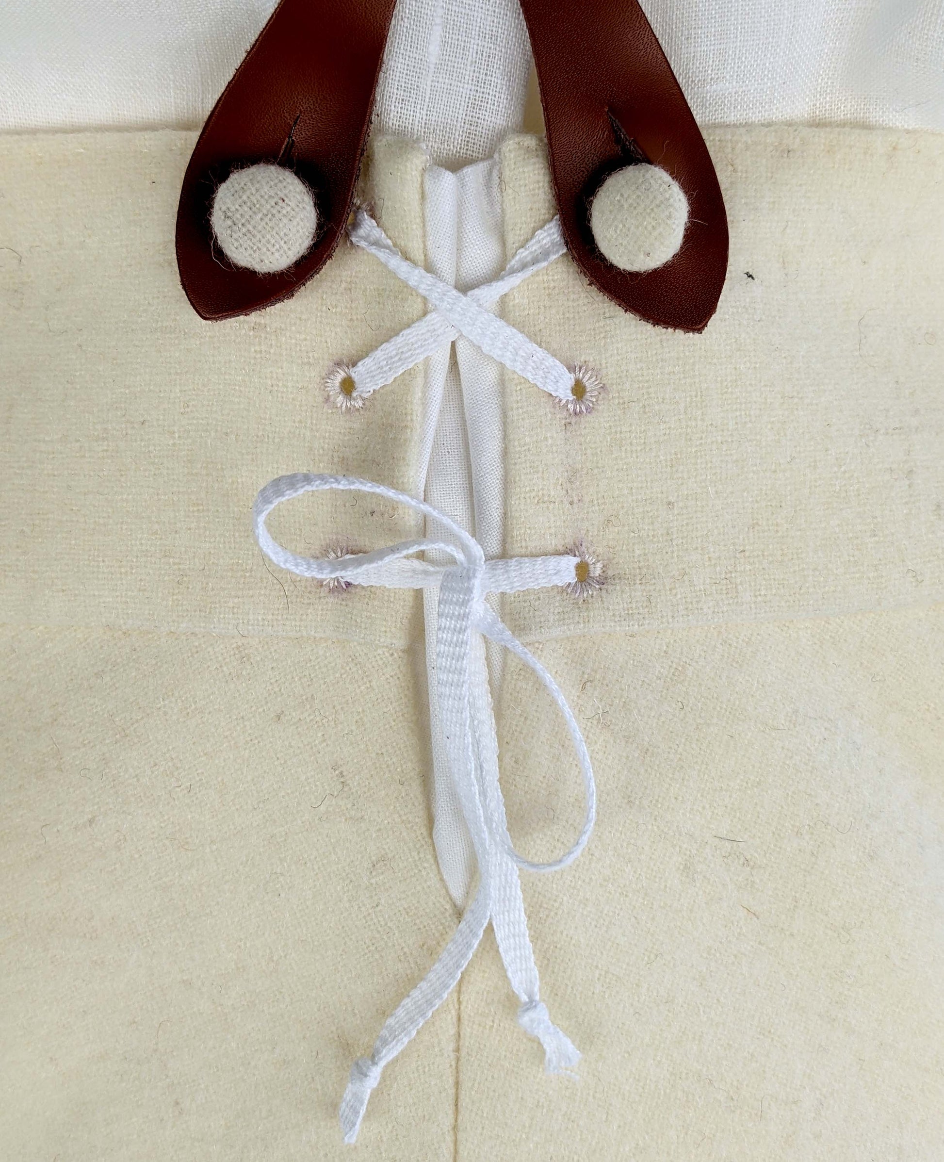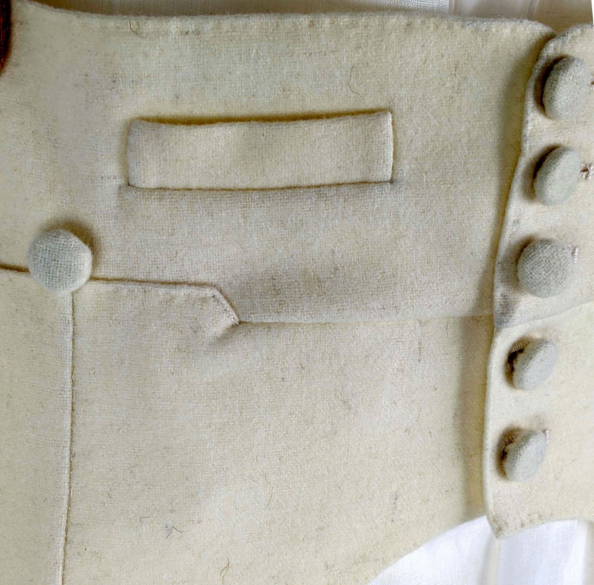 This sewing pattern shows breeches of the late 18th and early 19th century with a fall front, side pockets, and a coin pocket at the waistband (welt pocket). The breeches are buttoned at the knee, the narrow knee band is closed with ribbons. They have a wide waistband, buttoned in the front underneath the fall, the width of the waistband can be regulated with a cotton tape at the back. Compared to modern trousers, the breeches have a wide back and diverging legs to get the width needed while sitting on horseback. They are cut with one seam only along the outside leg, optionally the second leg seam can be added easily.