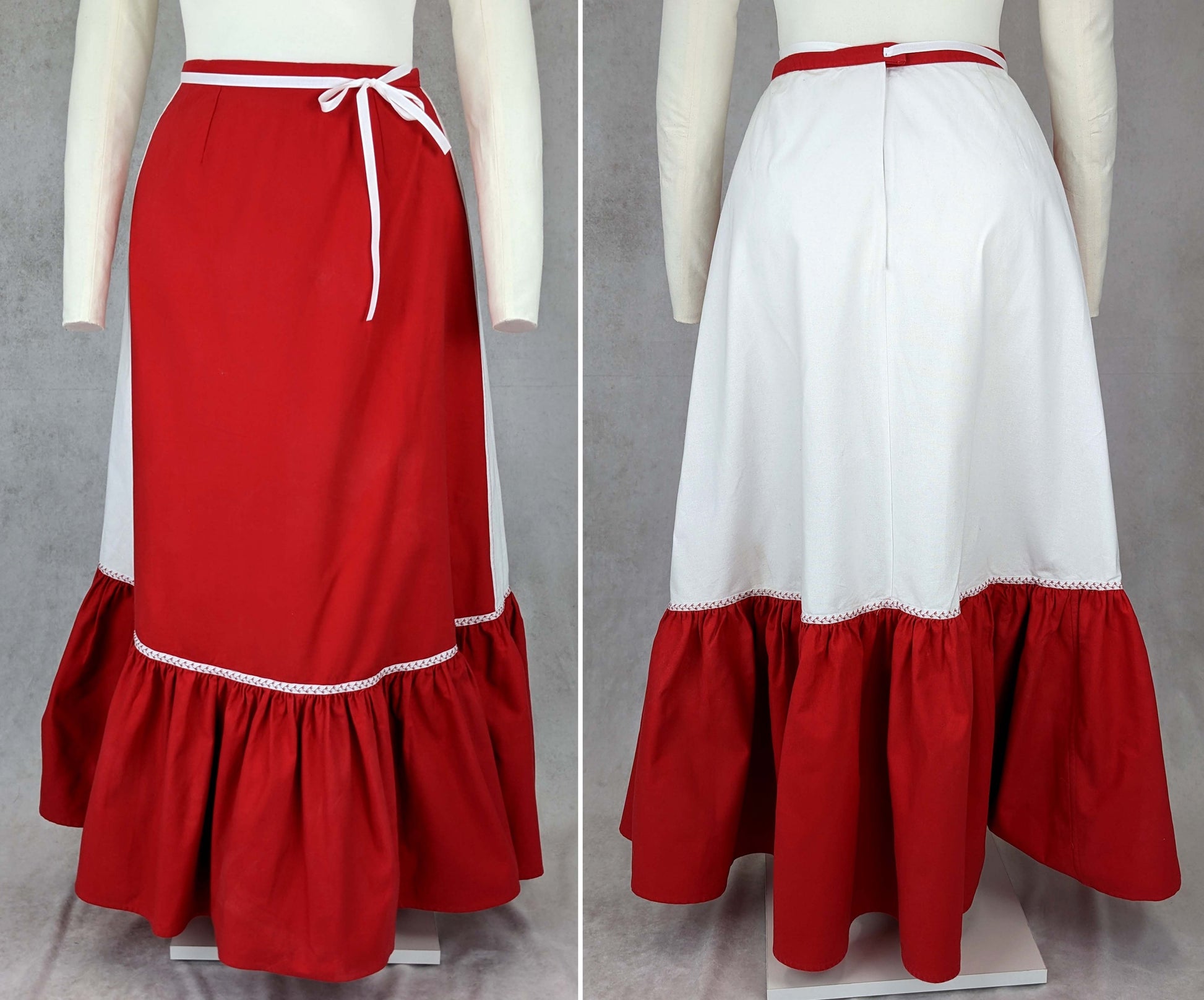 View A and petticoat: A simple unlined skirt, fitted around the hips, with the ruffle running around the hem. The petticoat has no placket, just a vent, and a narrow waistband, and is tied up in the front with cotton tape. The skirt and petticoat can be lined up with the wrong sides together to a common waistband. The petticoat pattern also goes perfectly with #0414 Fan Skirt.