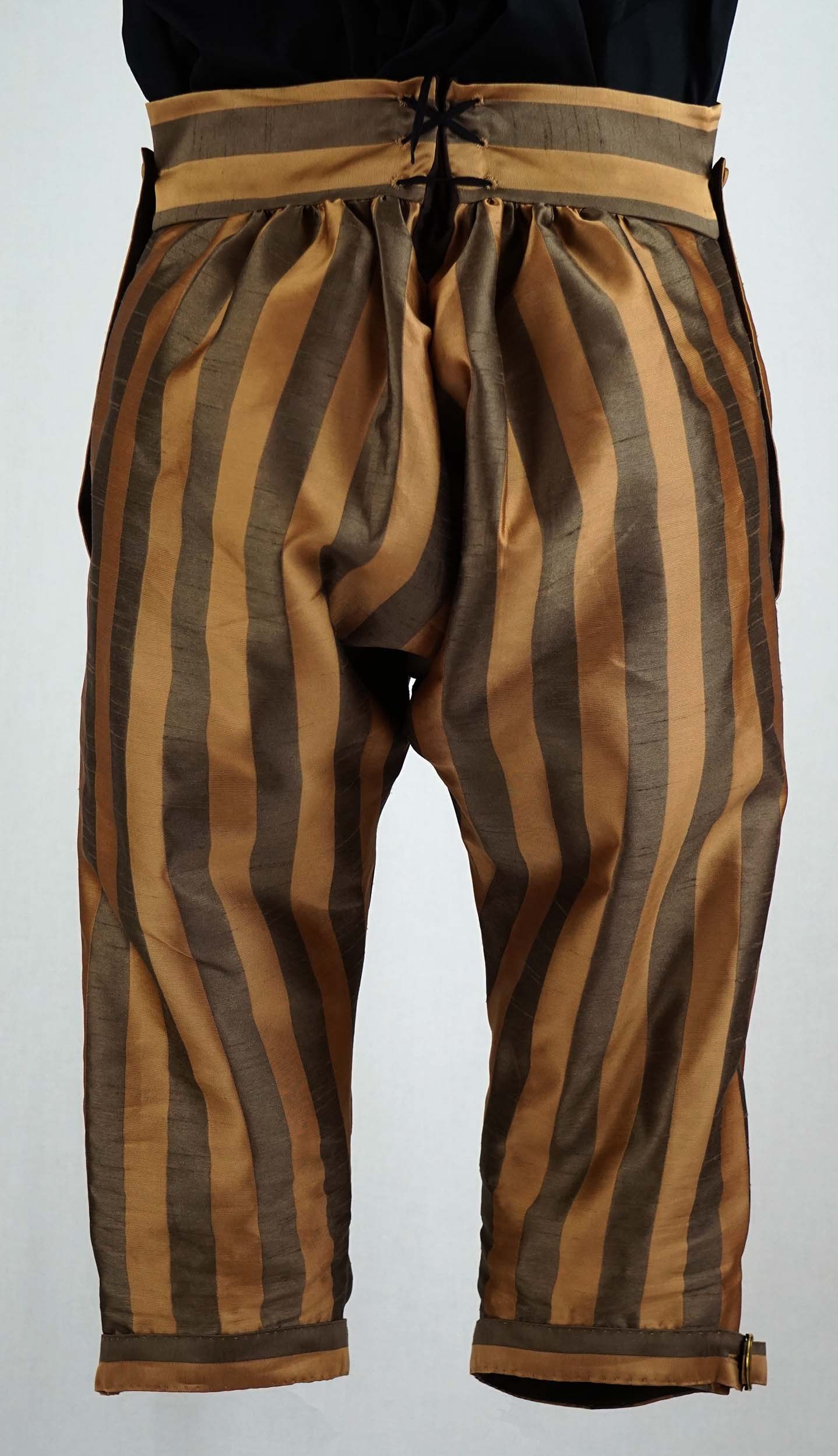 This sewing pattern shows breeches of the late 18th century with a wide fall front, in-seam back pockets, two pockets hidden under the fall front and a watch pocket at the waistband (welt pocket). The breeches are buttoned at the knee, the knee band will be closed with a buckle. They have a wide waistband, buttoned in the front, the width of the waistband can be regulated with a cotton tape at the back. The breeches have a wide back, compared to modern trousers and are fully lined with a light to midweight linen or cotton fabric.