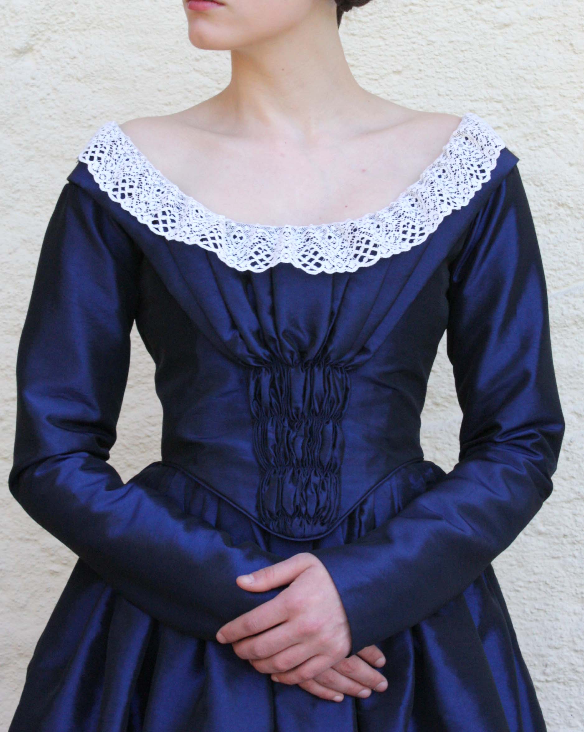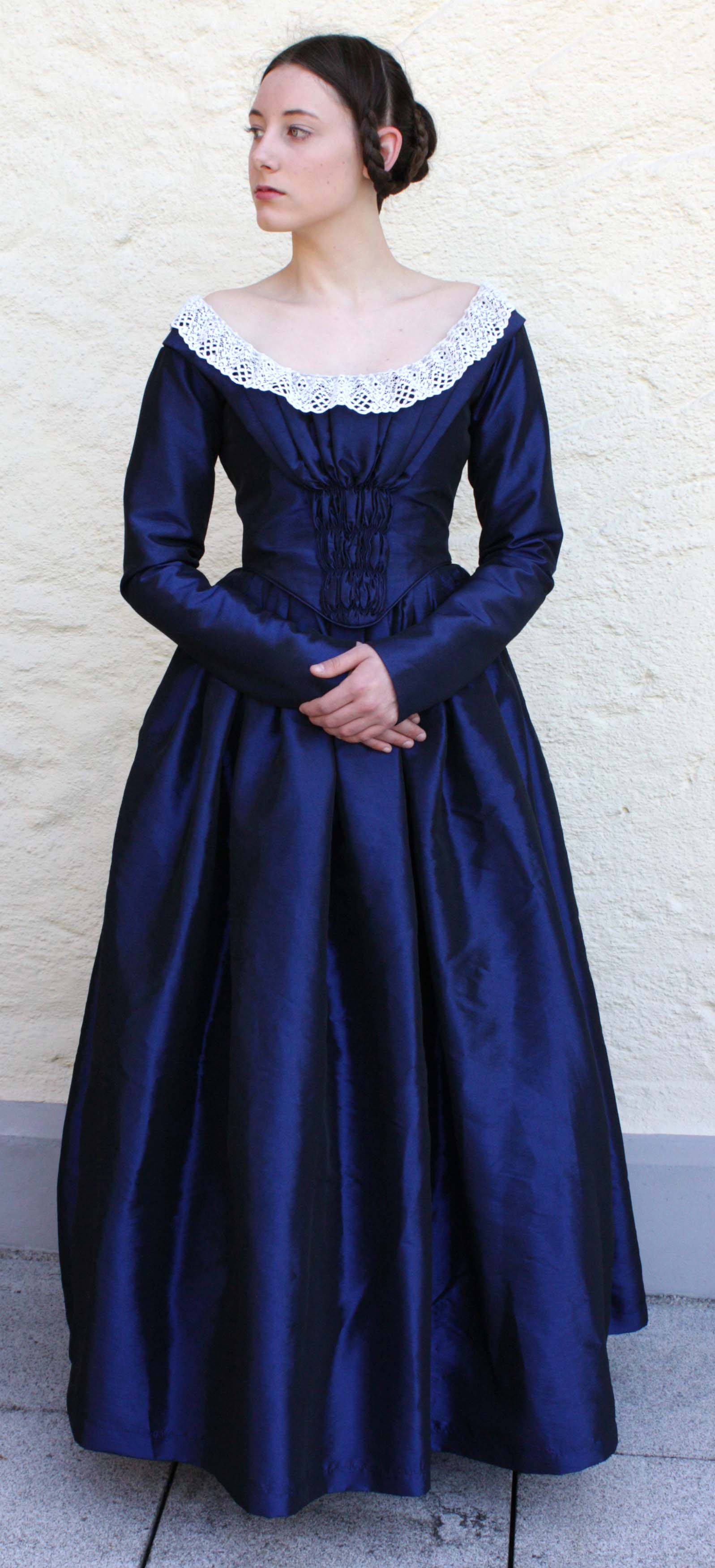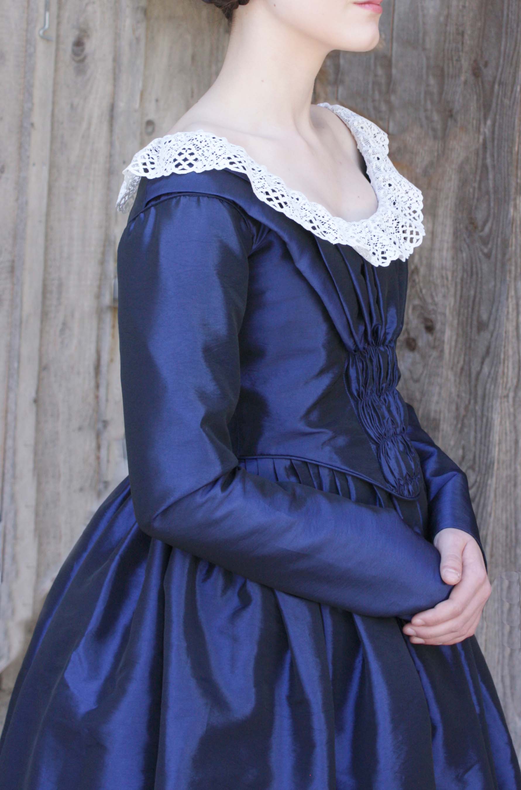 This dress is based on extant day dresses and daguerreotypes from 1840 to 1845.