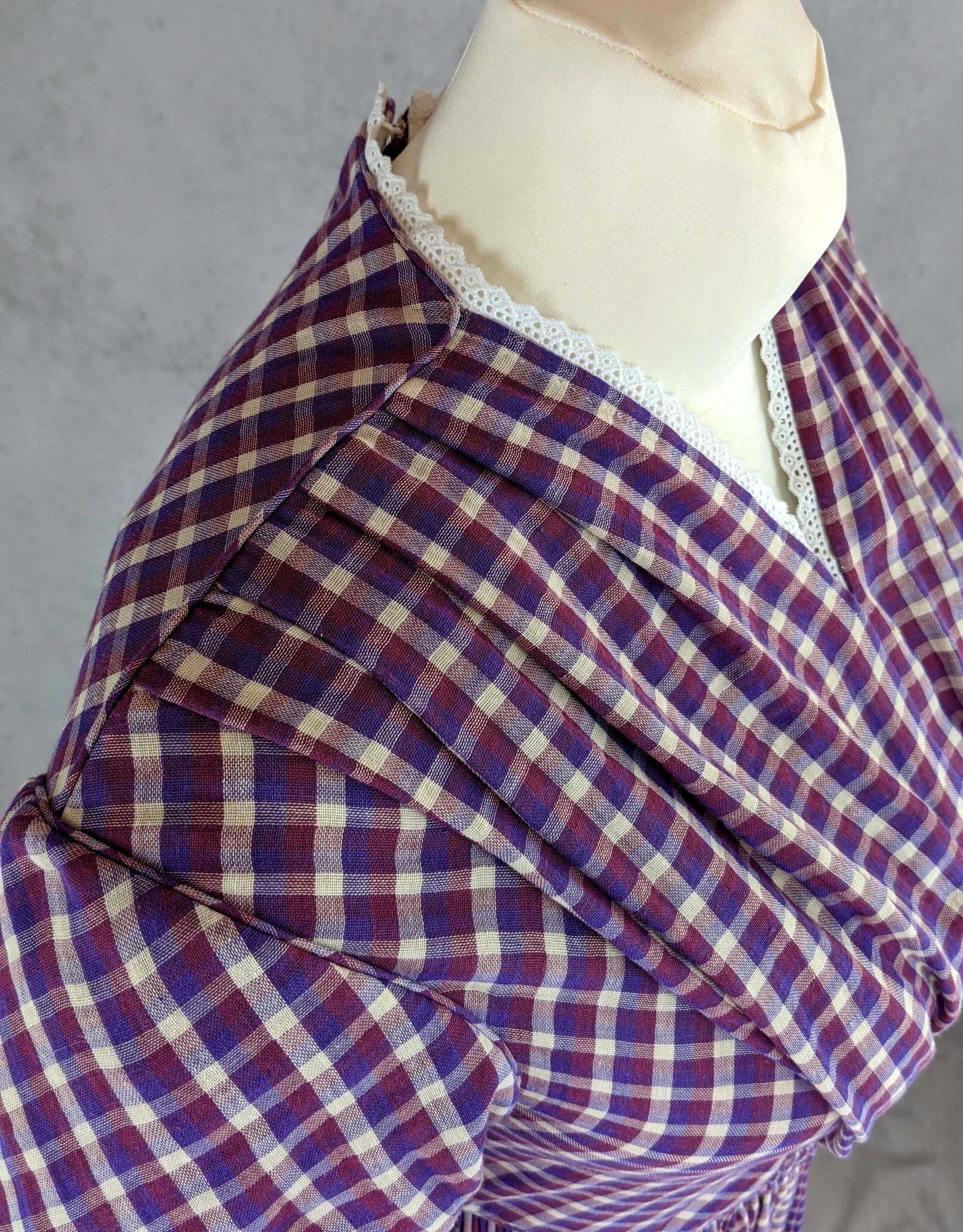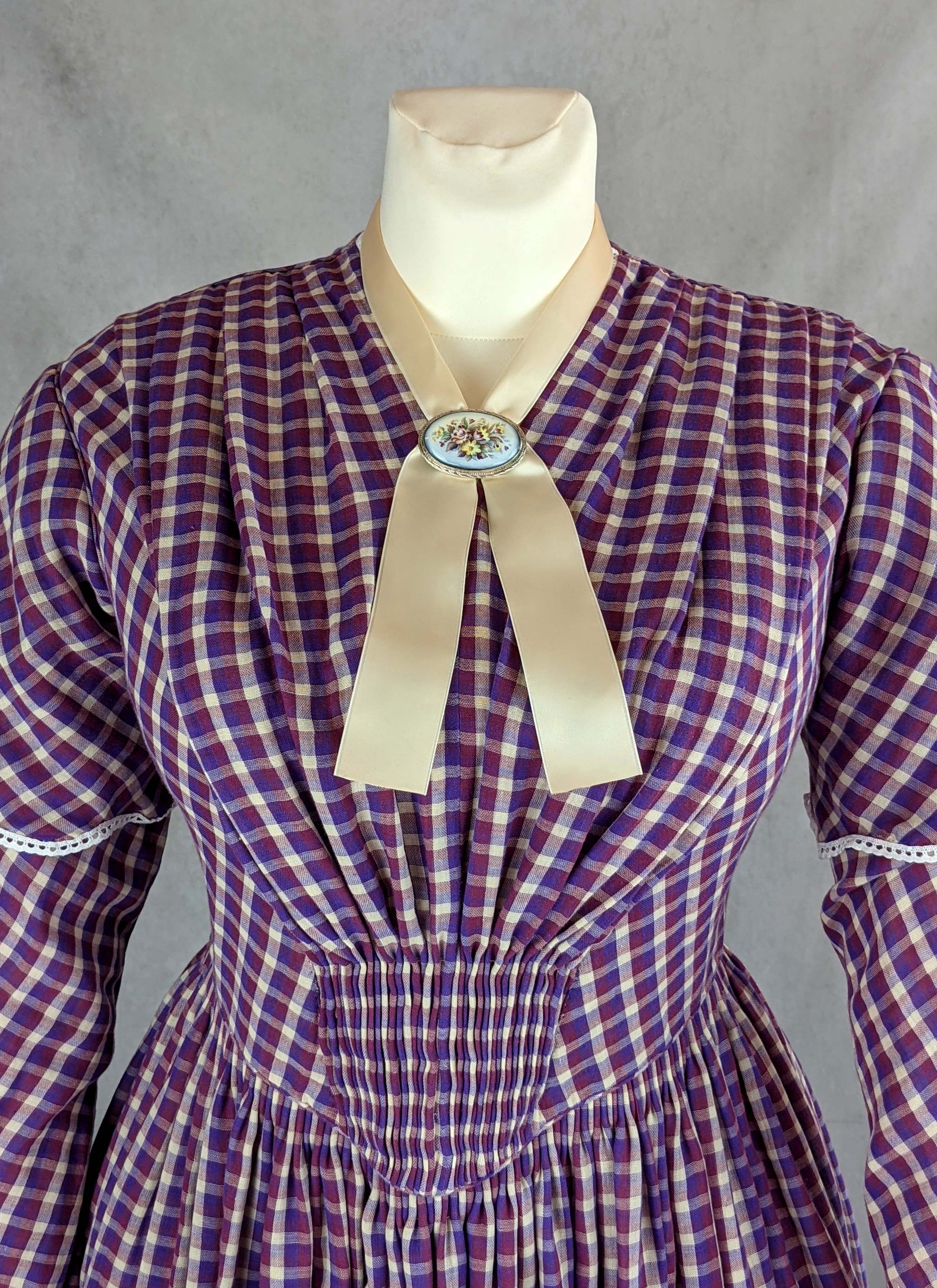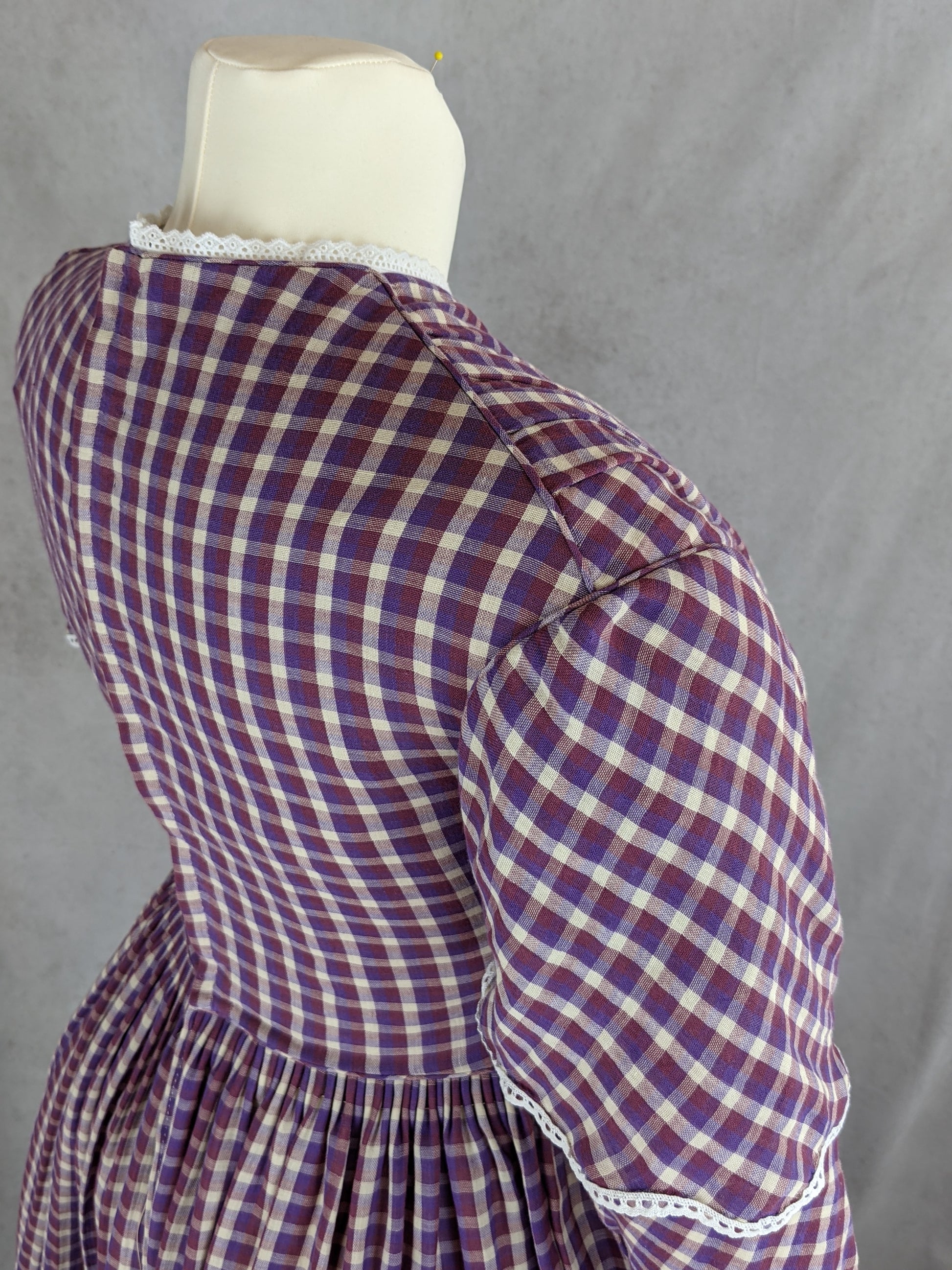 This dress is based on extant day dresses and daguerreotypes from 1840 to 1845.