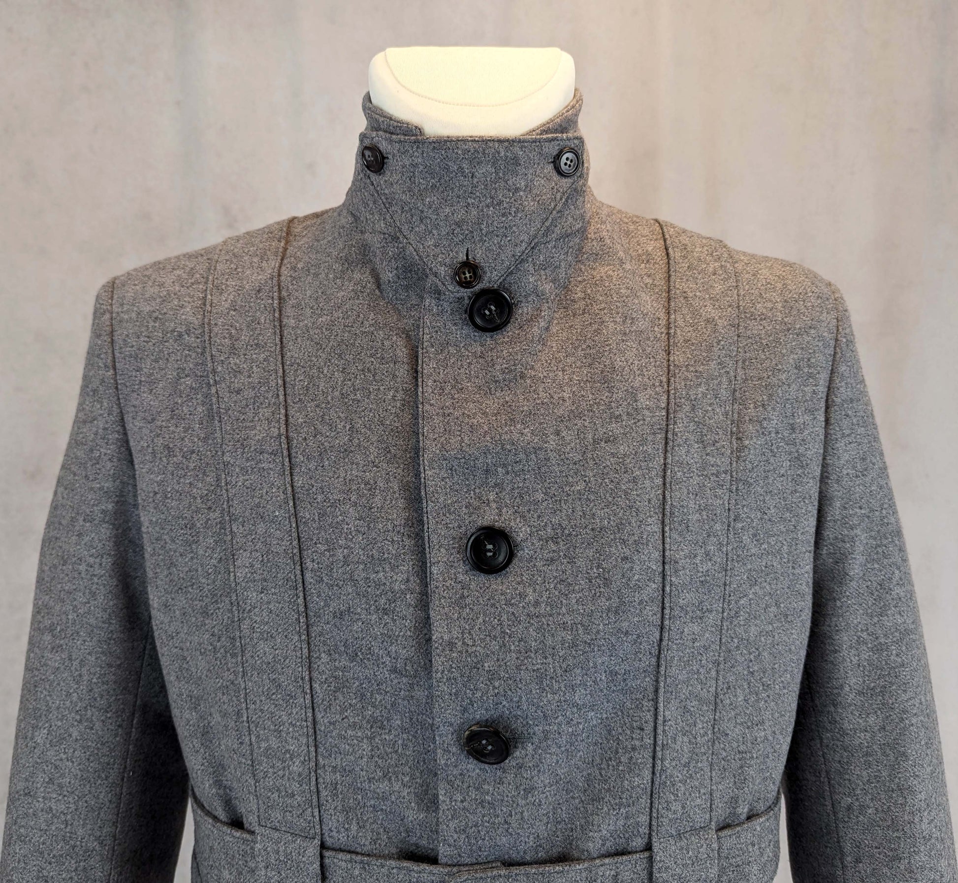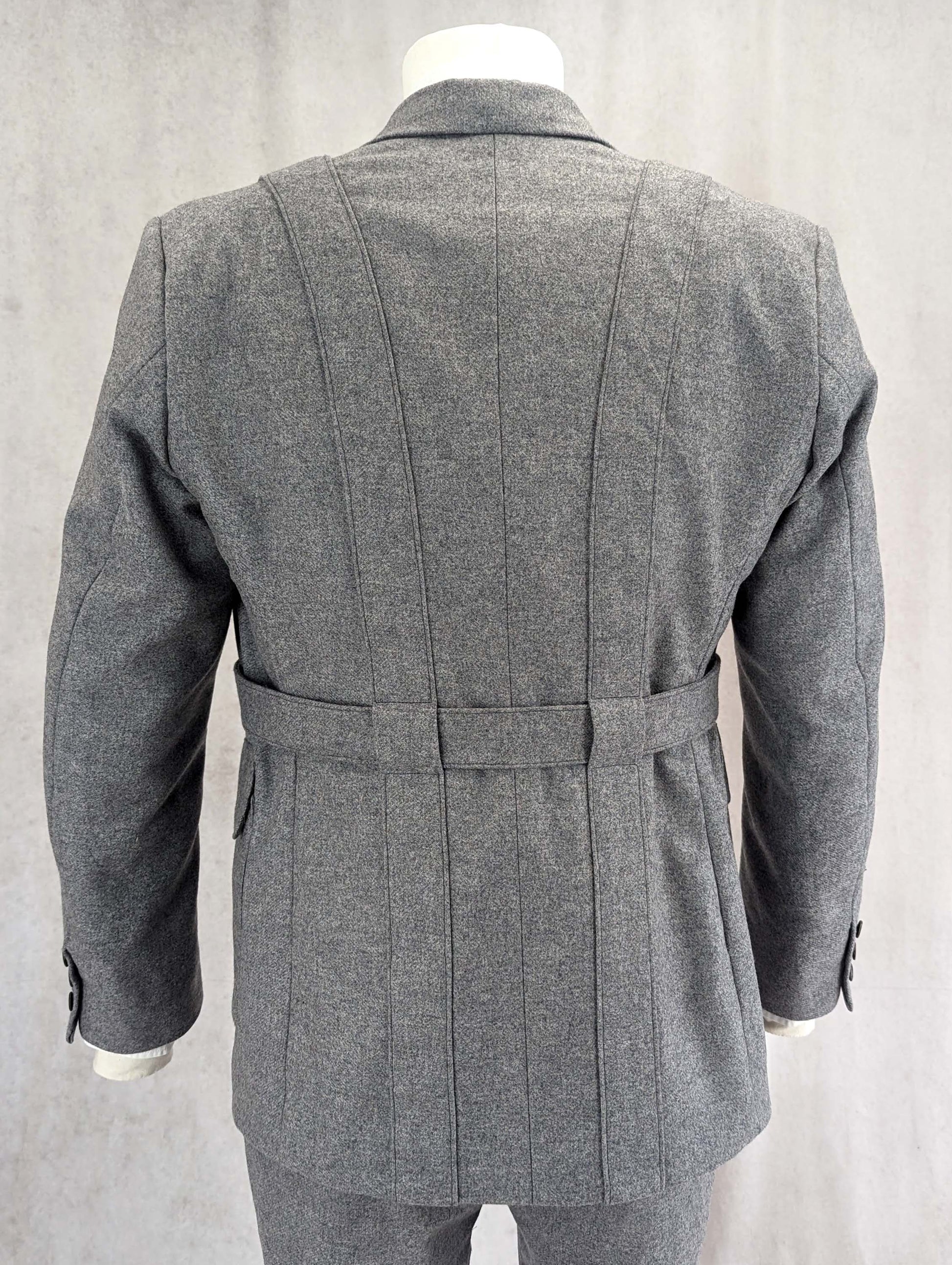 A jacked named “Norfolk Jacket” appears in English fashion illustrations from 1860 as a jacket for young men. Characteristic details of a Norfolk jacket are quite big patch pockets and a belt. Some jackets have box pleats running down the fronts and back, and some have straps running down the fronts and back instead of the pleats, acting as belt loops. Some models have a yoke, some do not.
